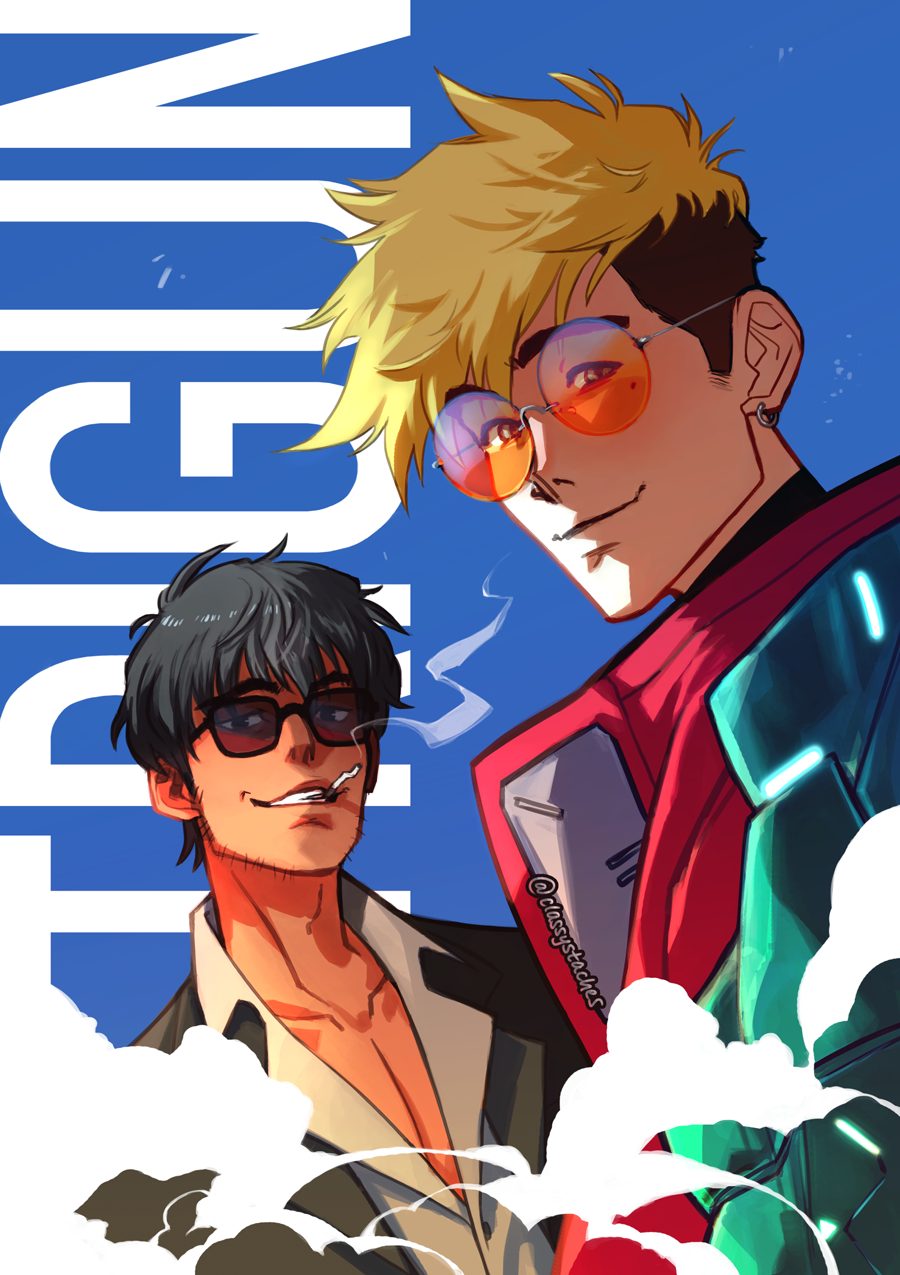 I thought it would be great to contrast the detail of the characters with a bold blue background that calls back to the bright blue sky of some of the show’s environments — and then I added TRIGUN as a kind of logo and some smokey design elements to tie it all together.